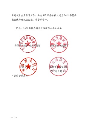 根據(jù)《安徽省優(yōu)秀建筑業(yè)企業(yè)認(rèn)定暫行辦法》和《關(guān)于開展安徽省優(yōu)秀建筑業(yè)企業(yè)認(rèn)定有關(guān)工作的通知》。省住房城鄉(xiāng)建設(shè)廳會(huì)同省交通運(yùn)輸廳、省水利廳、省通信管理局組織開展了2021年度安徽省優(yōu)秀建筑企業(yè)認(rèn)定工作。