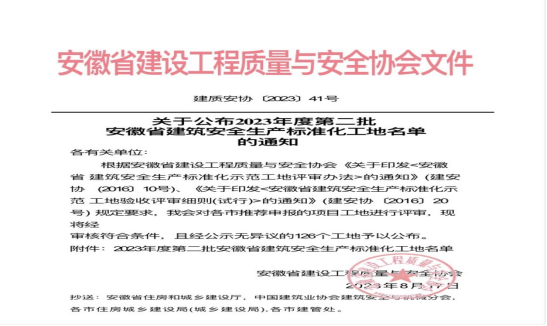 8月17日,安徽省建設工程質量與安全協(xié)會發(fā)布2023年度第二批安徽省建筑安全生產標準化工地名單,黃山建工集團仙人洞南路東側D1地塊(文瀾軒)項目獲評“安徽省建筑安全生產標準化工地”。