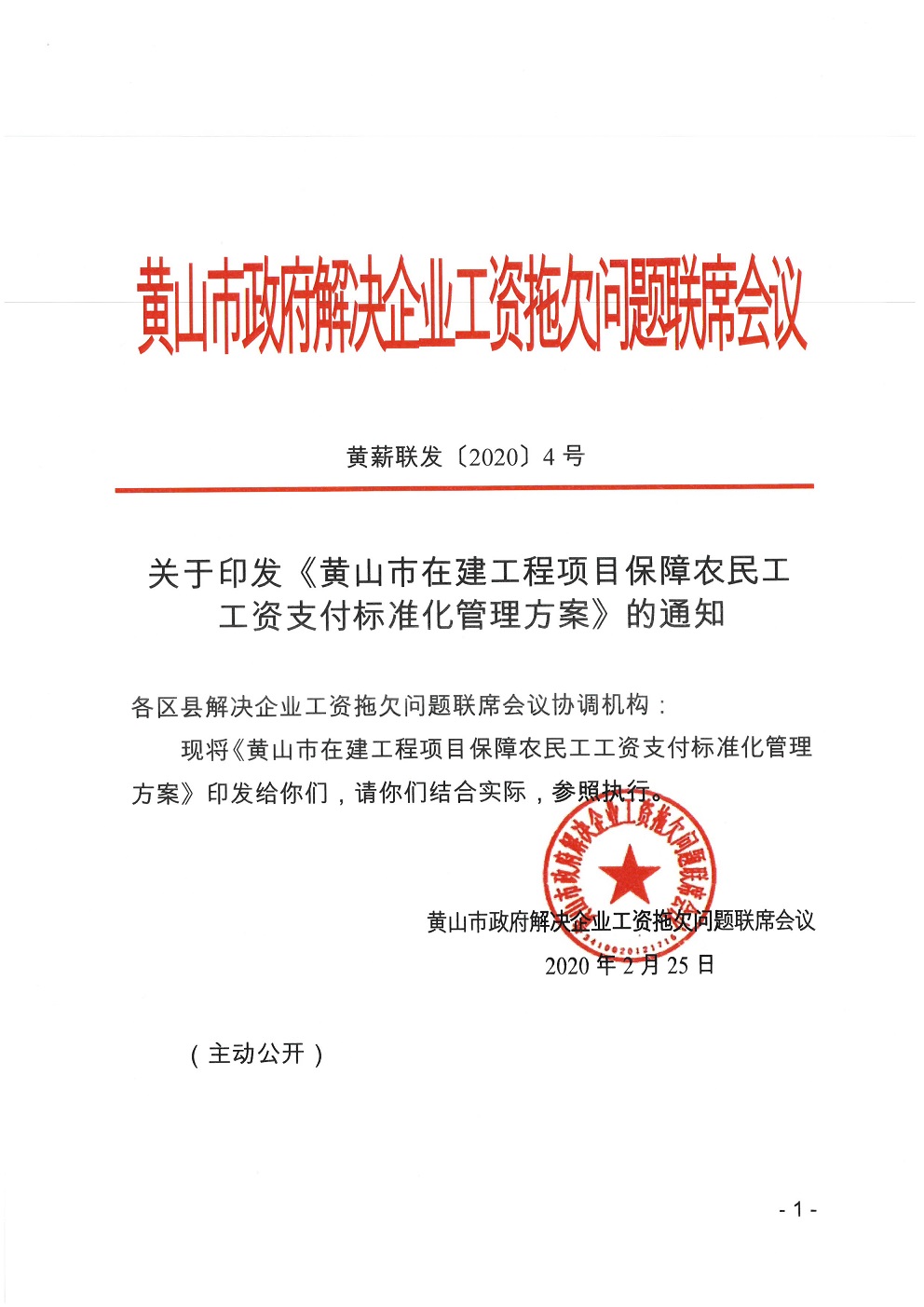 關于印發(fā)《黃山市在建工程項目保障農民工工資支付標準化管理方案》的通知.doc